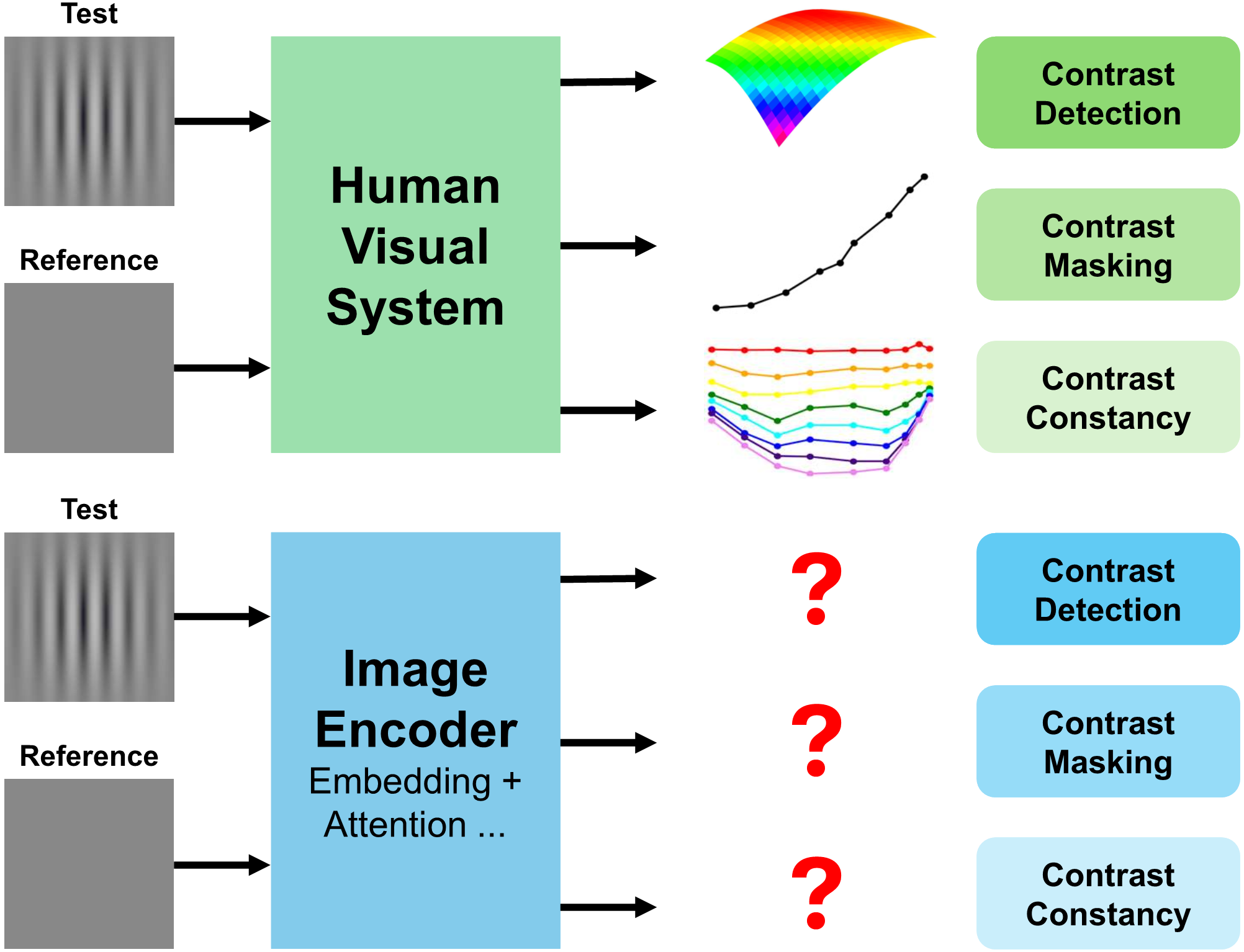 OpenCLIP, replicate low-level properties of the human visual system (HVS), including contrast detection,